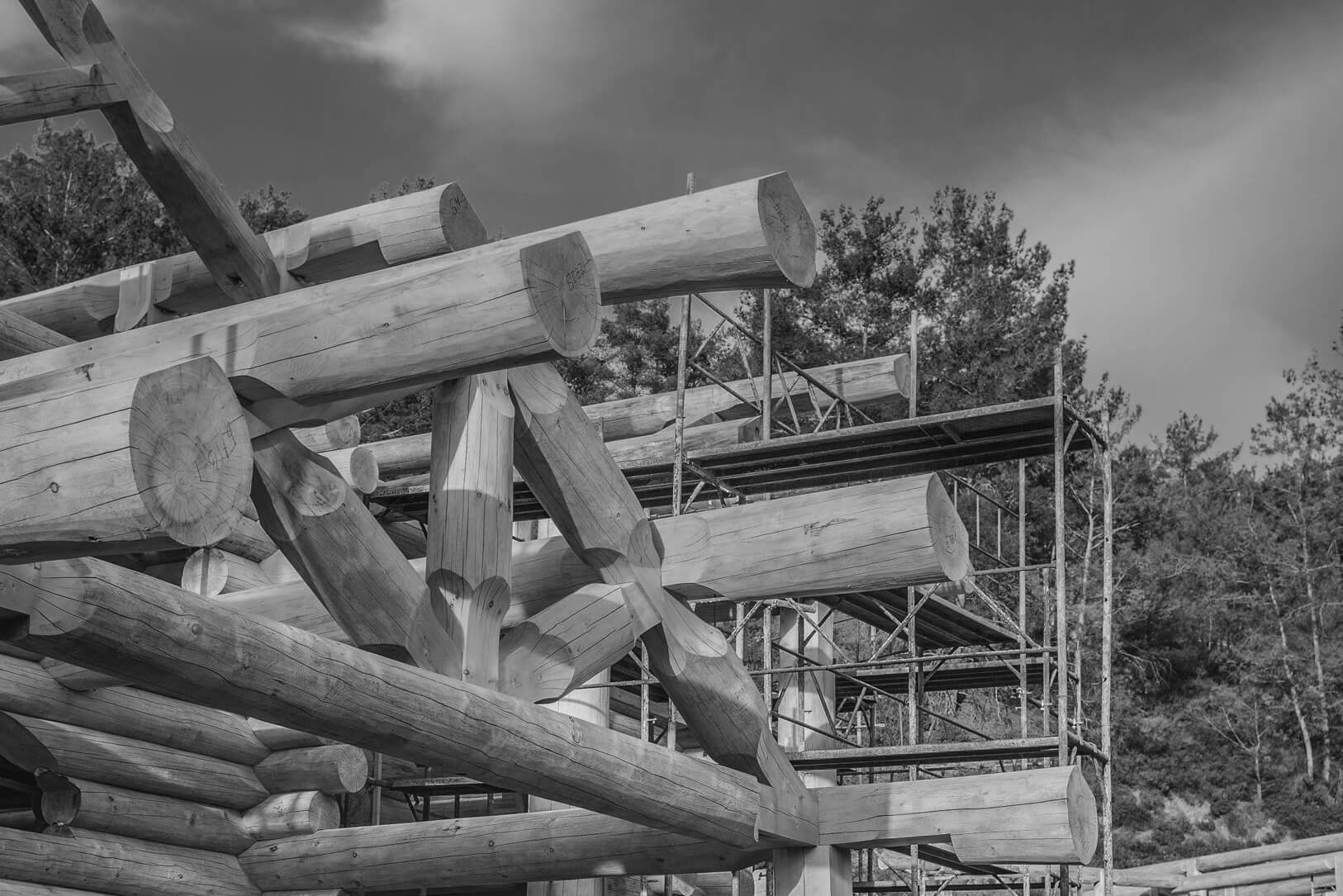 Закончили монтаж обоих домов, готовы два сруба бани и бревенчатый каркас гаража.