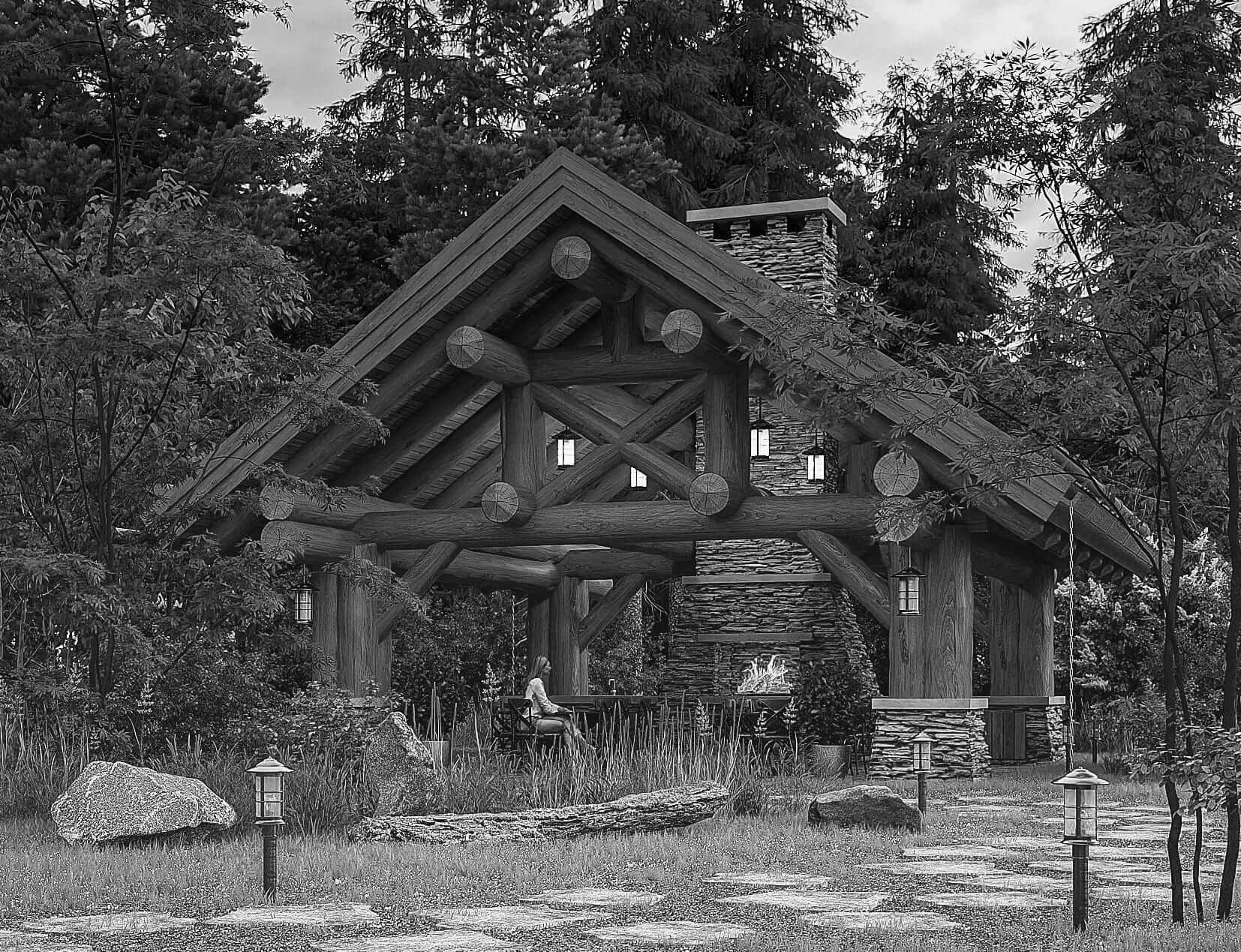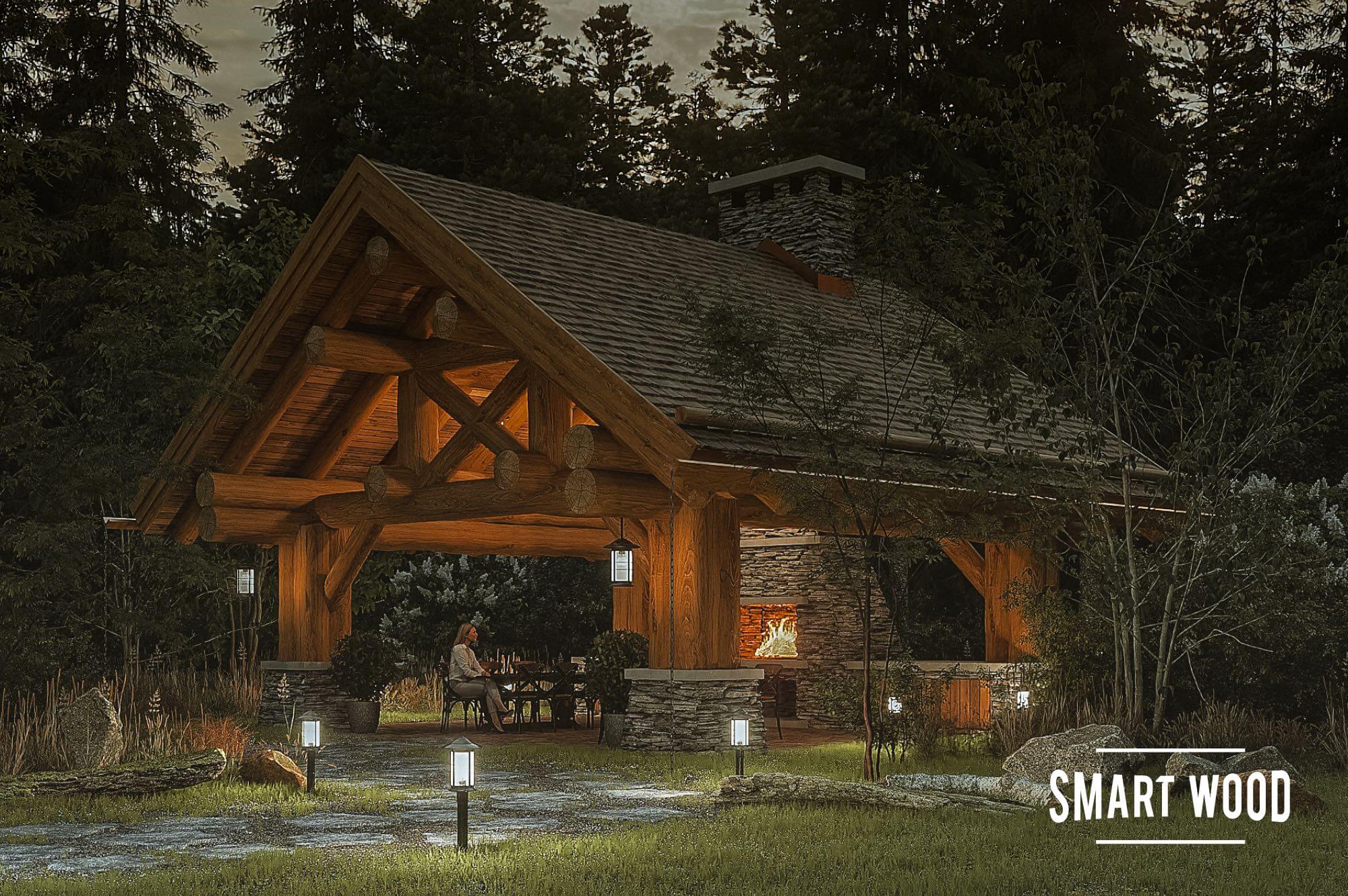 По сути своей «Тойма» — это кухня-столовая на свежем воздухе, место, где можно приготовить барбекю и провести время с друзьями и семьей. По нашей задумке беседка будет выполнена из сибирского кедра, достаточно крупного — от 500 мм. в диаметре. Остов беседки — каркас Post&Beam, финишное крышное покрытие кровли — лиственничная дранка. Все это довольно классические и очень лаконичные решения — мы хотели, чтобы такая постройка легко вписалась в любой участок и гармонично смотрелась с любым, уже построенным на нем домом. Характер же ей придают две яркие детали. Первая — крестовая ферма под крышей, которая одновременно несет на себе нагрузку и в то же время делает фасад беседки объемным и запоминающимся.
