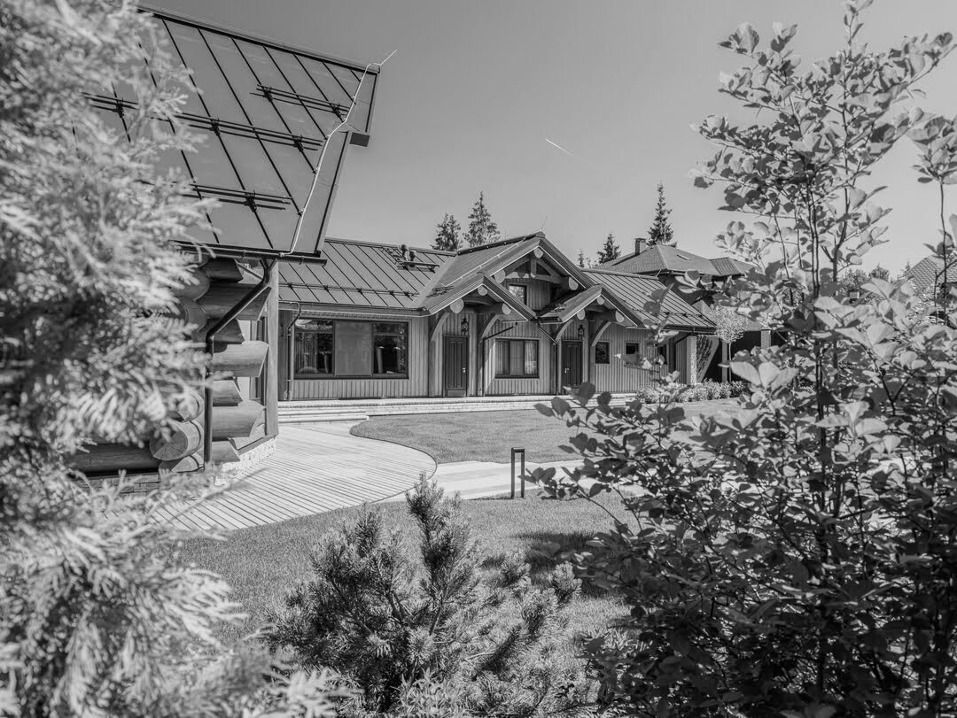 Гараж «Мериот» — бревенчатый каркас Post&Beam из кедра. Кухня с панорамным остеклением летом превращается в беседку благодаря раздвижным окнам.