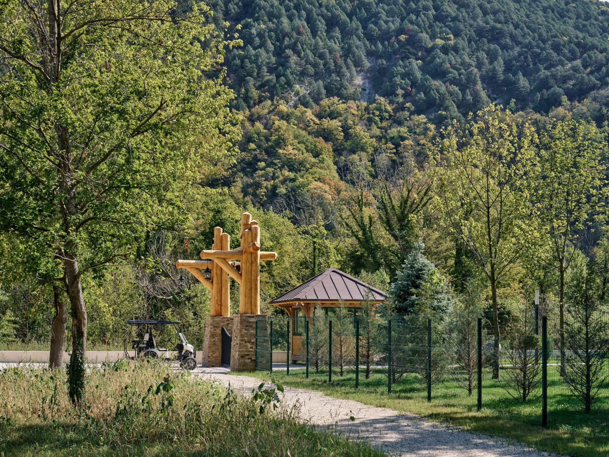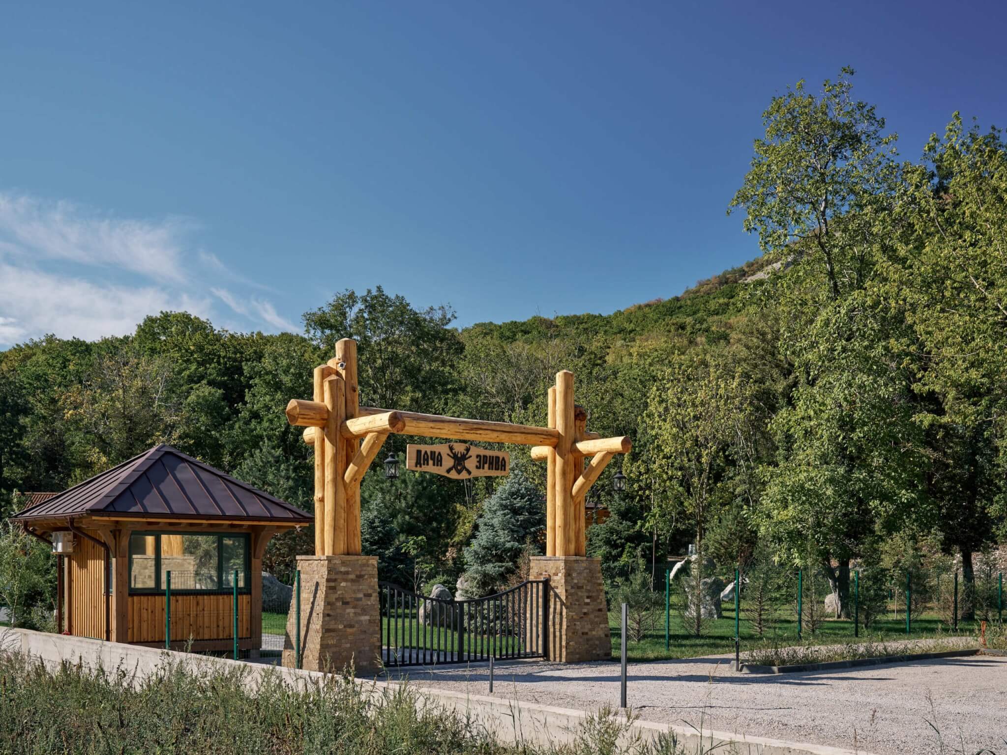 На начало интересного путешествия и предстоящие впечатления намекают необычные ворота. На прочных массивных основаниях из бетона, отделанных натуральным камнем, возвышаются две колонны, каждая из которых состоит из четырёх брёвен разной высоты. Смотрится эта конструкция самобытно.