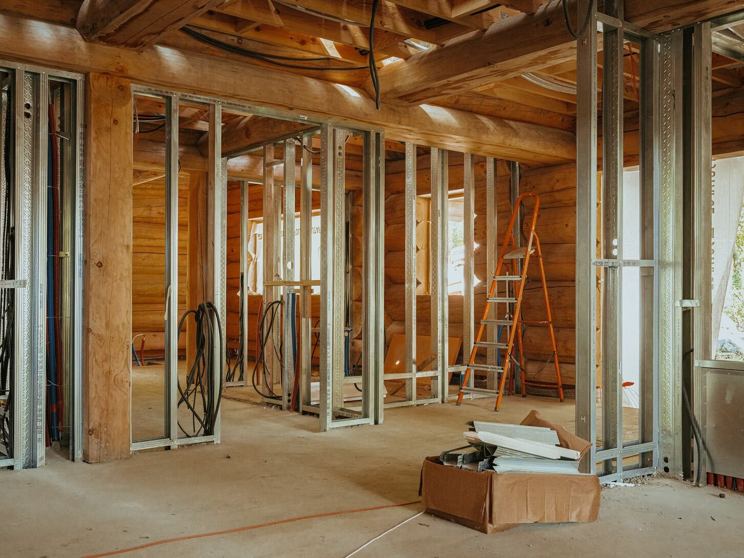 Сейчас мы шлифуем и красим сруб дома, работаем над отделкой каркасных перегородок и прокладываем коммуникации в доме.