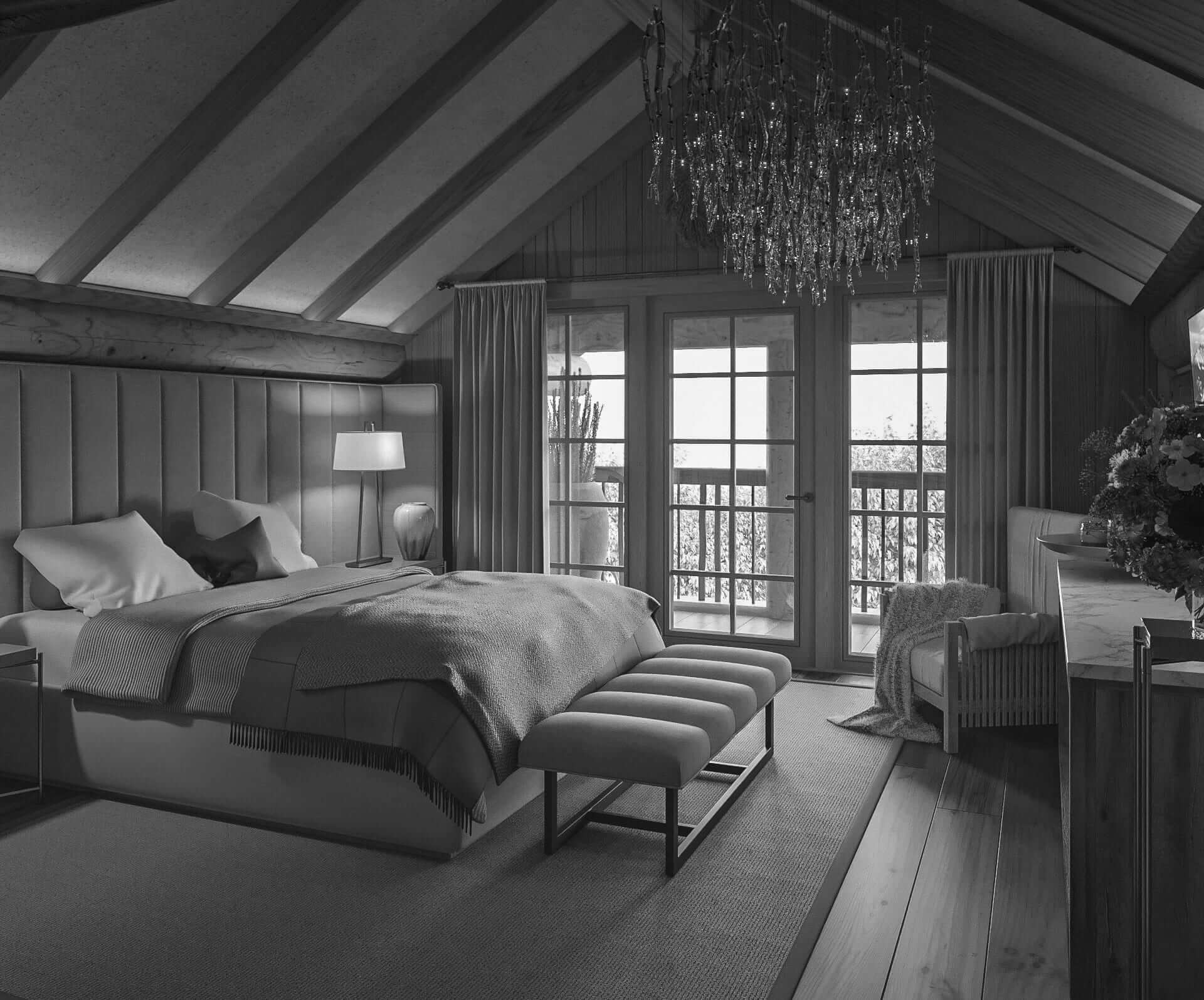 Дом несет в себе две функции. С одной стороны это место для отдыха хозяина комплекса, с другой — здесь нужно было организовать еще две спальни для гостей и большую, комфортную зону отдыха. Поэтому мы условно разделили дом на две части. Второй этаж дома отведен под мастер-спальню. Она, разумеется, самая большая по площади, с собственной просторной ванной комнатой и гардеробной. Вся мебель и светильники здесь, как и во всем остальном доме, будут произведены на заказ нашими постоянными партнерами — например, в мастер-спальне банкетка будет выполнена в виде старинного сундука, а люстра стилизована оленьими рогами. Ванная комната при мастер-спальне единственная в доме оснащена большой чугунной ванной помимо душевой кабины, на полу, не изменяя концепции всего дома, плитка из натурального сланца, ей же выложен пол первого этажа.