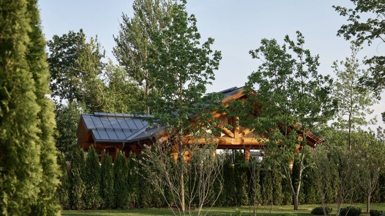Технология приглянулась ещё и благодаря возможности добавить цвета внешней отделке. Материалы, которые использовали для строительства, — лиственница и кедр.