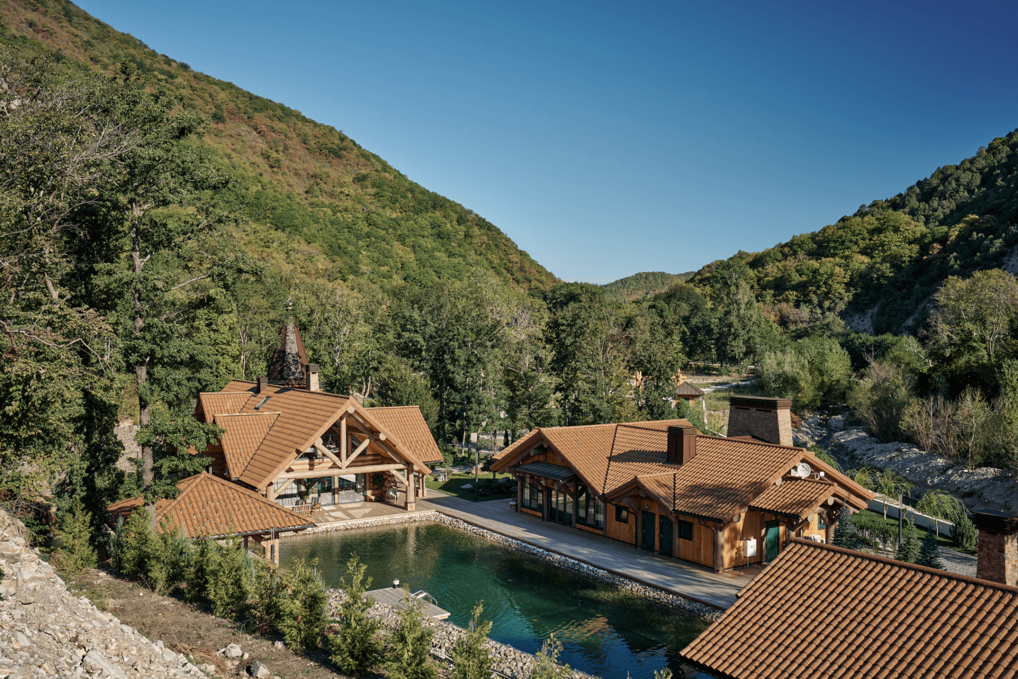 Красивое сочетание дерева и камня в отделке, деликатная подсветка в парной, мебель из массива дерева во всех строениях, мягкие диваны и кресла — все сделано в природных оттенках и как будто стало продолжением внешних пейзажей.
