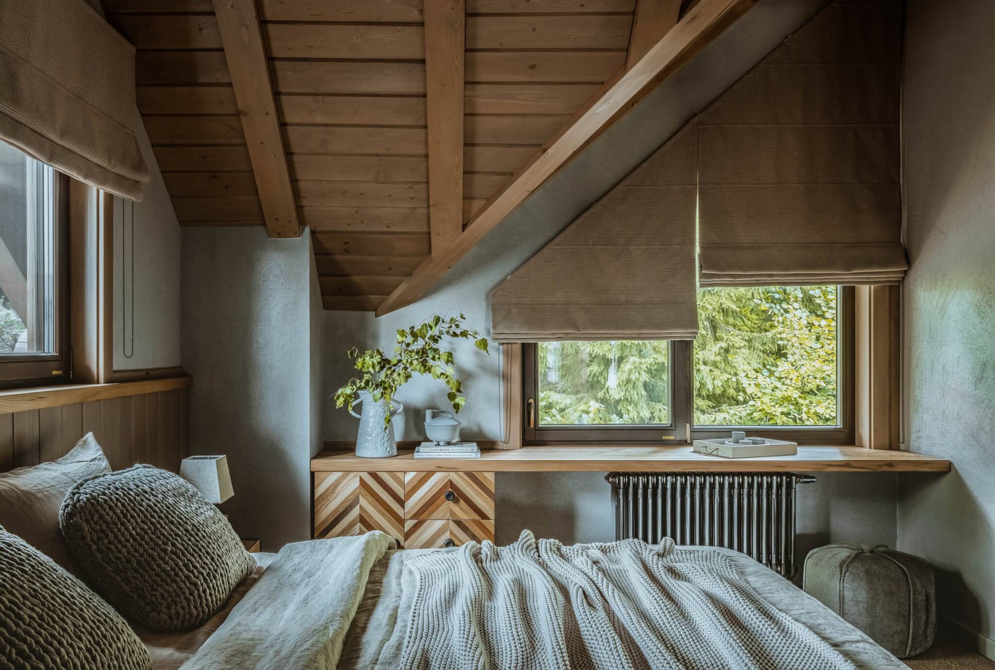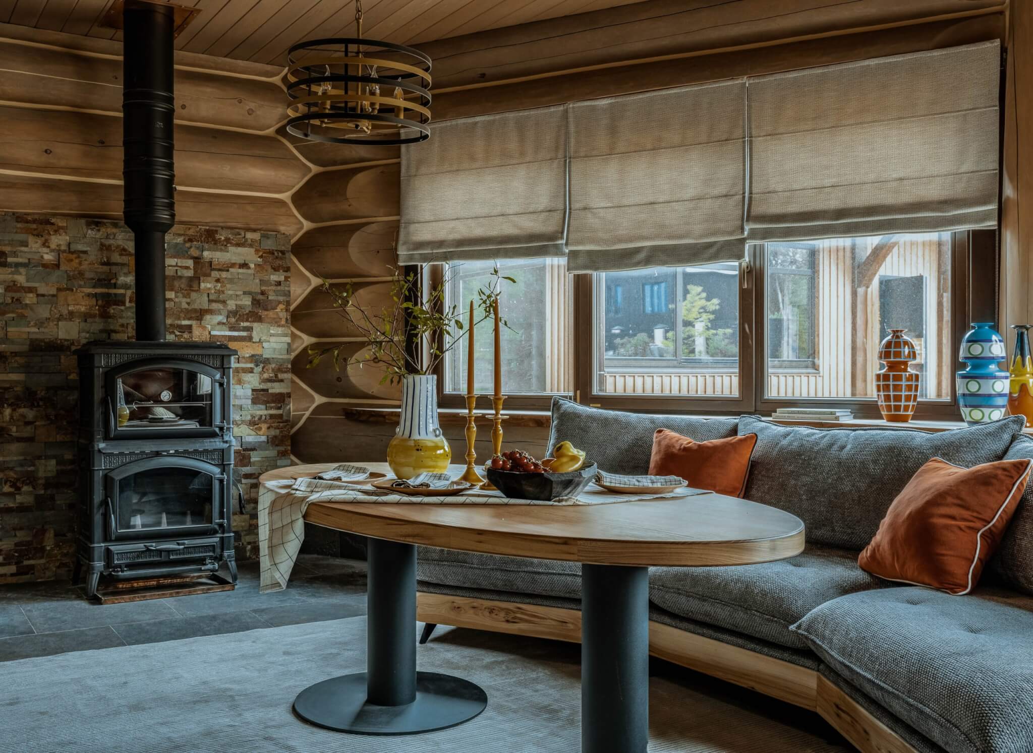«Мериот» — двухэтажный дом-баня с двумя спальнями. Первый этаж отведён под парную, помывочную, санузел и уютную гостиную с камином и кухней. На втором расположились комнаты отдыха и просторное общее пространство с панорамными окнами.