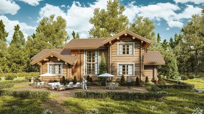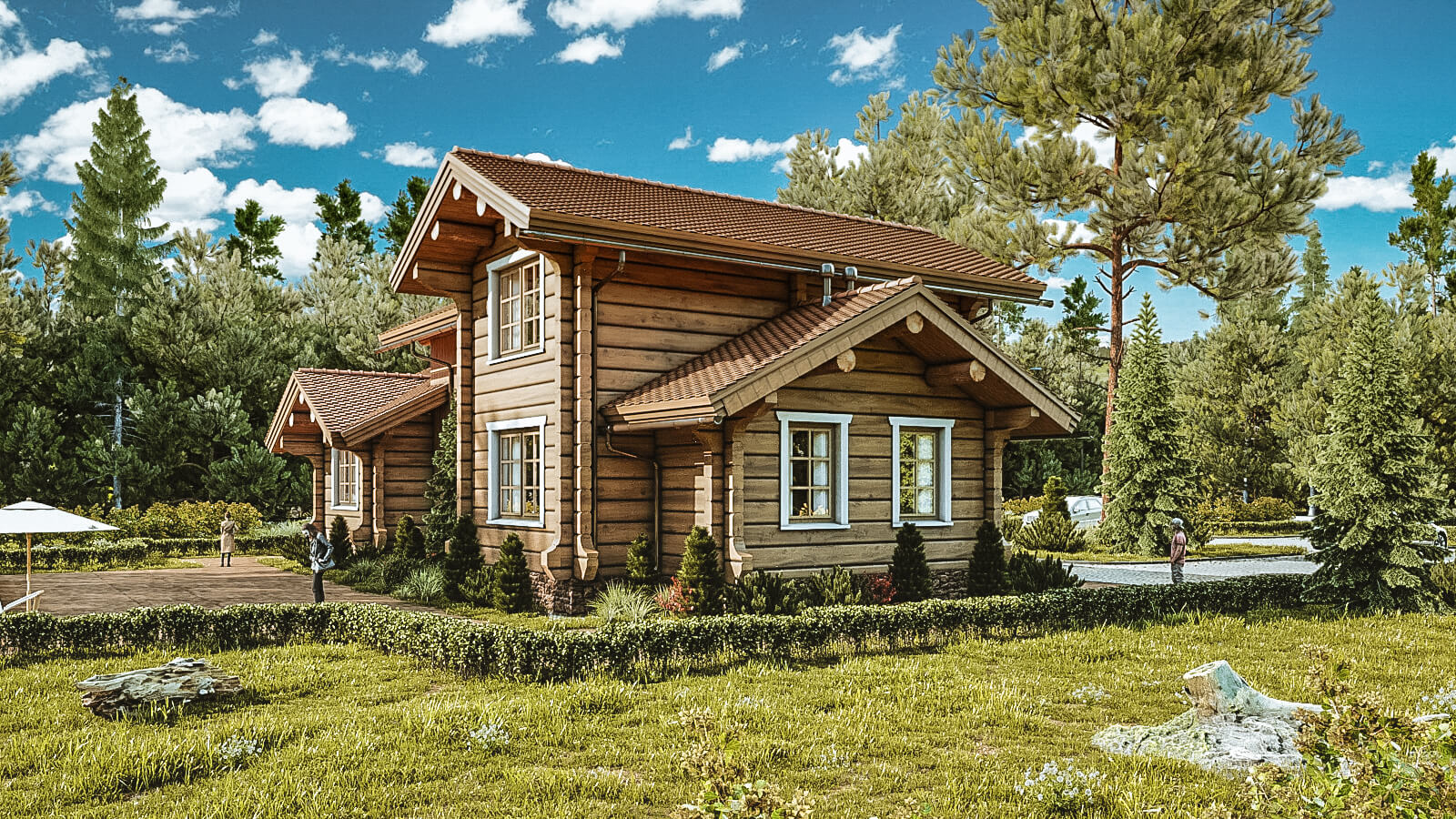 "Богучарово"- гостевой дом из лафета. На участке уже стоит большой — более 2000 м2 —особняк, и наш дом должен стать местом приема гостей, где сможет останавливаться дочь заказчика и его друзья.