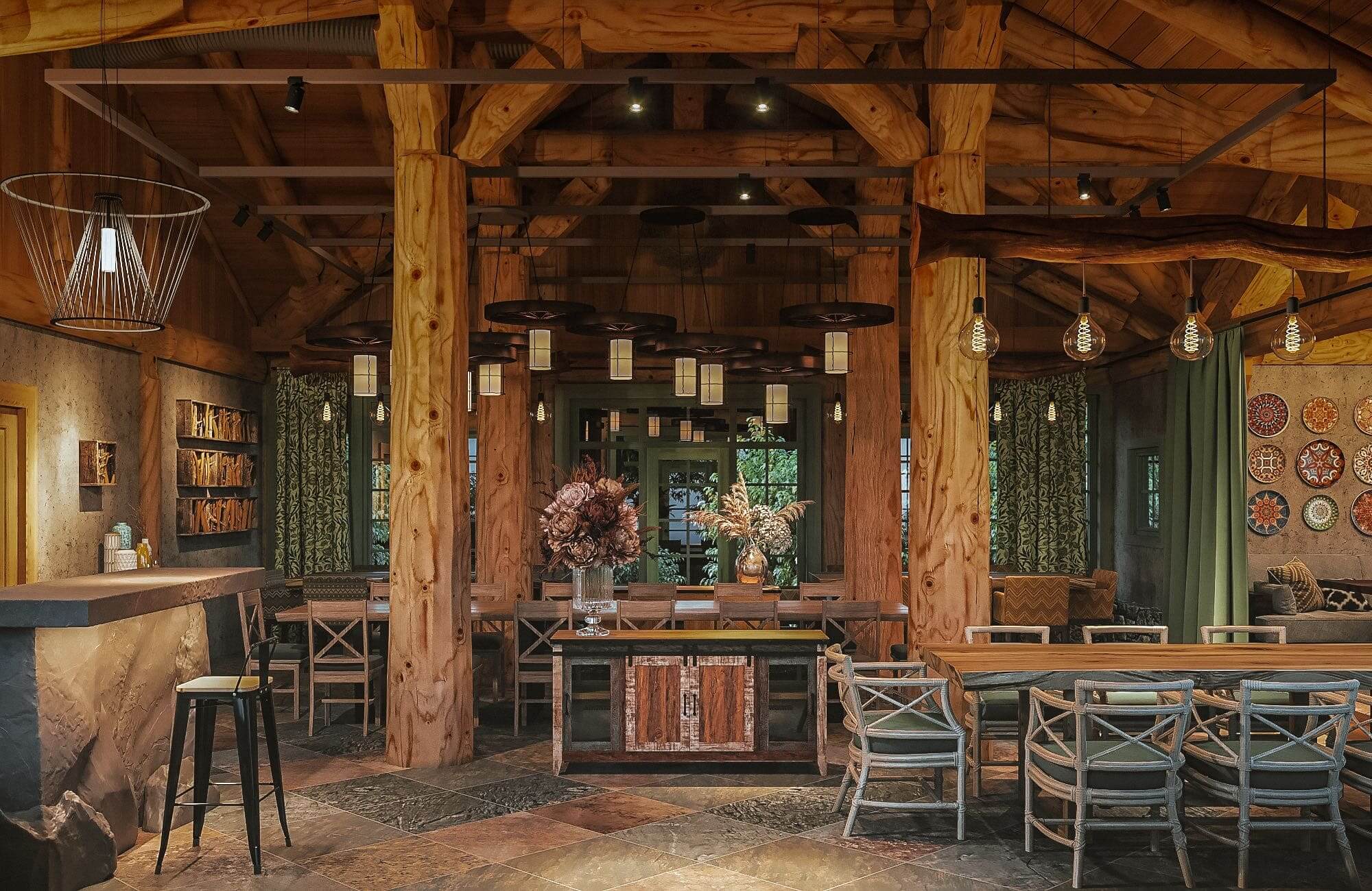 Из ресторана запланированы сразу несколько выходов. Первый — на общую открытую площадку комплекса, с проходом к пруду, бане и беседке.Второй — выход к горной реке, где можно будет отдохнуть и подышать свежим воздухом во время мероприятия или после сытного ужина.