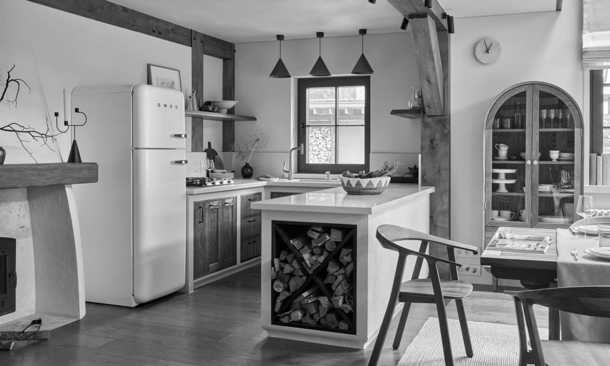 И здесь как раз речь о тех, кто «готовит» кухню. В нашем послужном «поварском» списке есть и лаконичные пространства с минимумом техники, и большие площади с отдельными погребами, холодильными камерами и системами хранения.