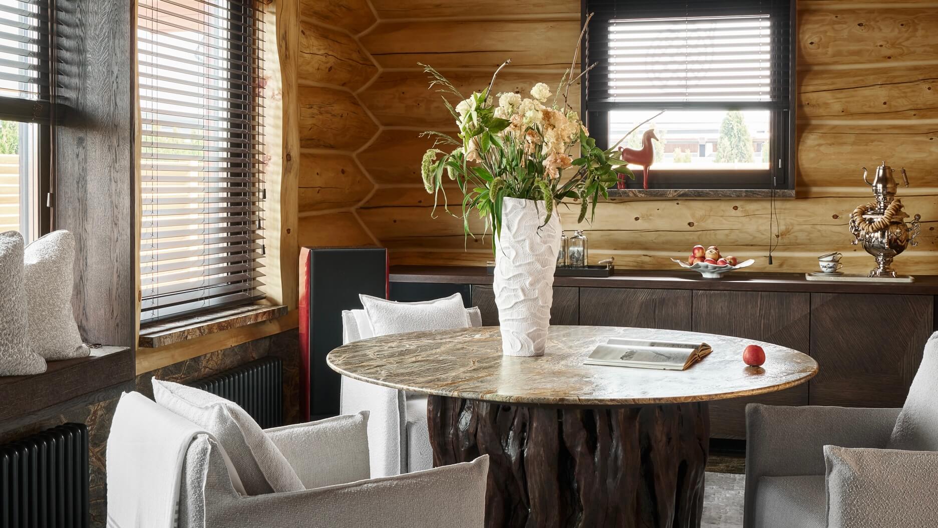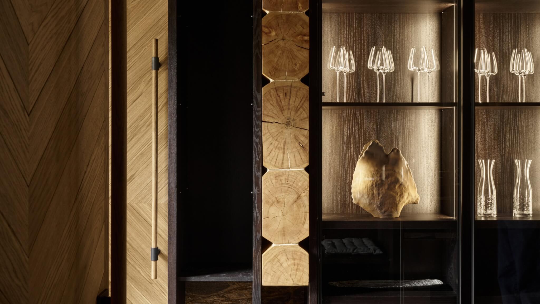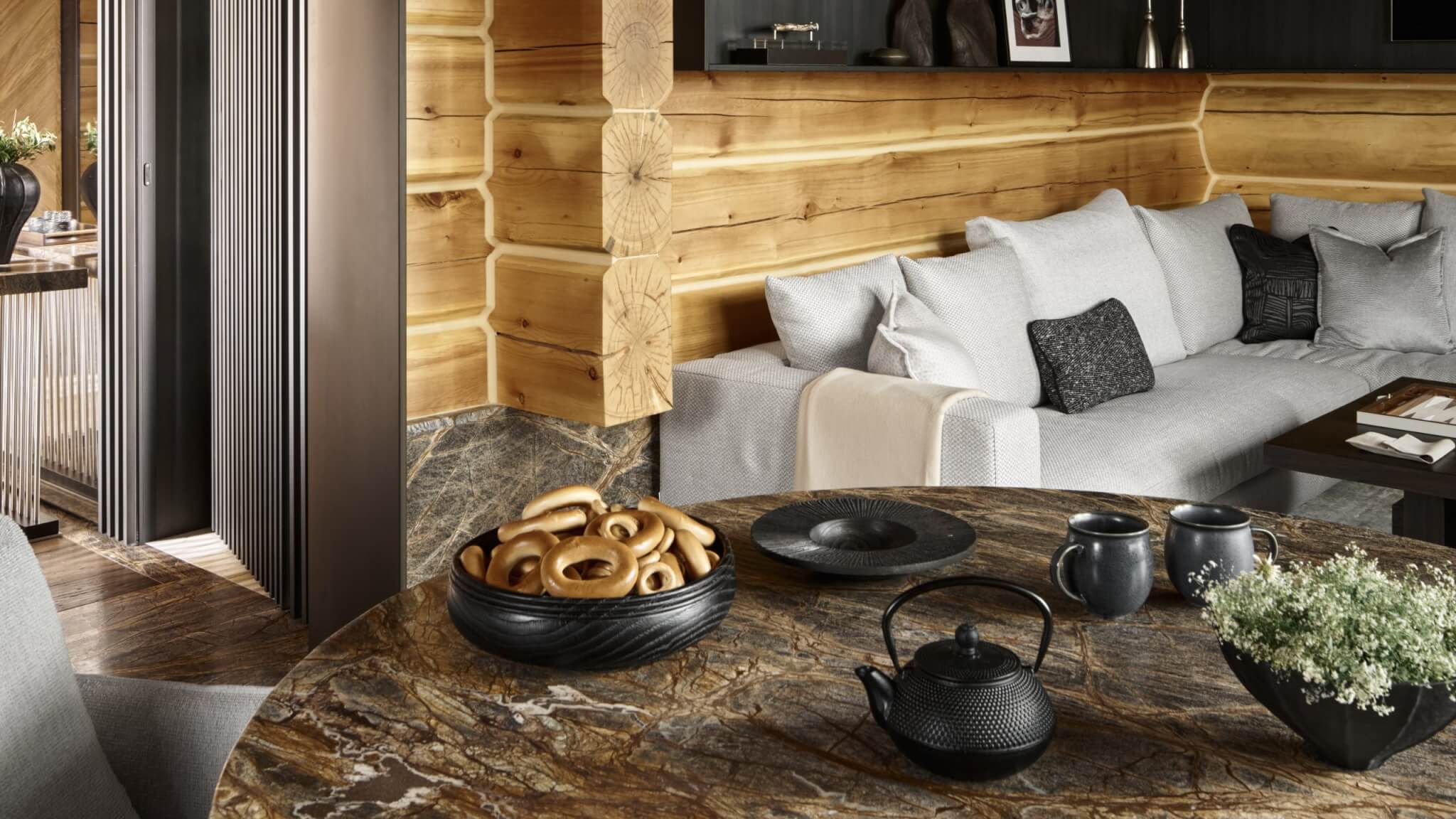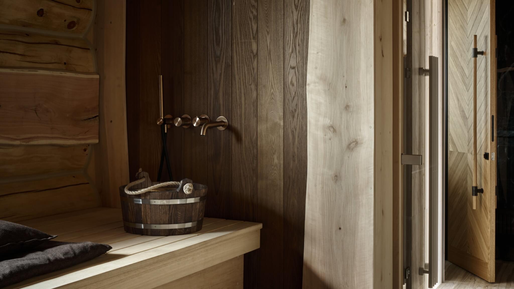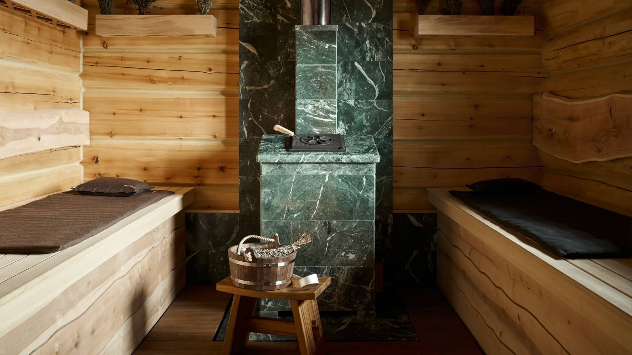 Концепция интерьера бани основана на благородном сочетании дерева, натурального камня и металла. Дверные проёмы и декоративные панели выполнены из стали, паркет ручной работы изготовлен из инженерной доски со шпоном дуба. В отделке стен и полов использованы мраморы Bidasar и Serpeggiante, а чугунная печь облицована серпентином.