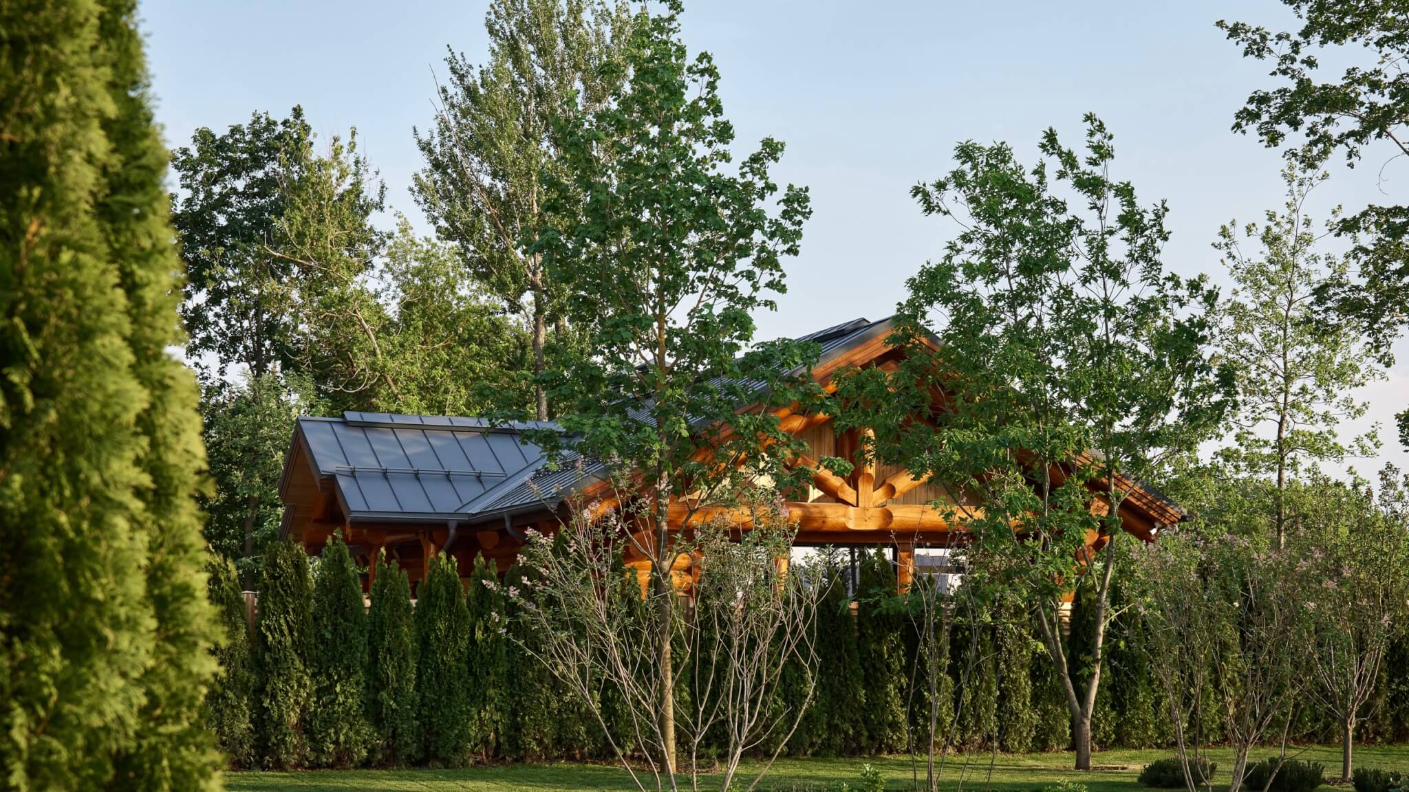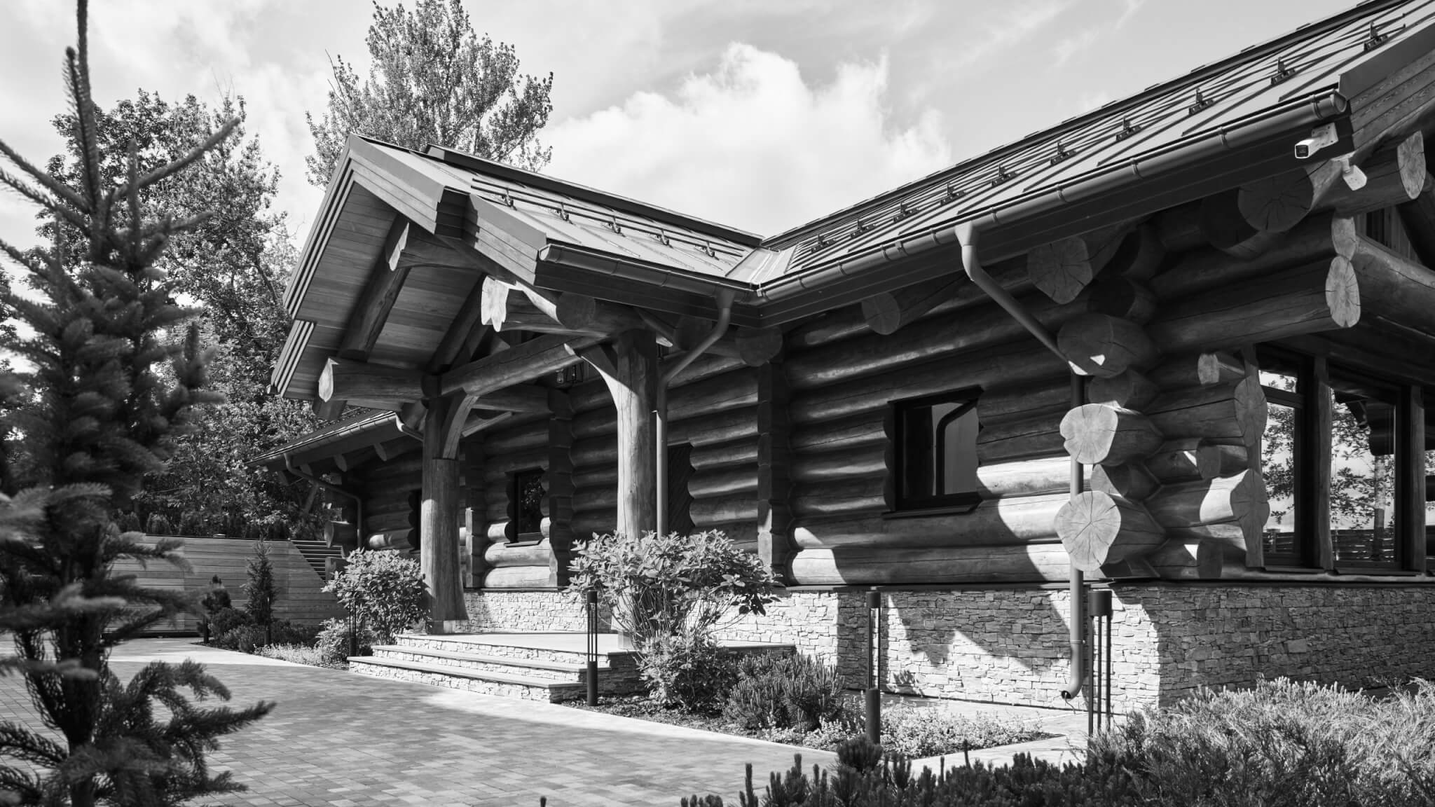 В основе конструкции — технология Post & Beam. Фасад здания украшают массивные бревенчатые фермы, придающие архитектуре выразительность и характер. Цоколь облицован натуральным камнем.